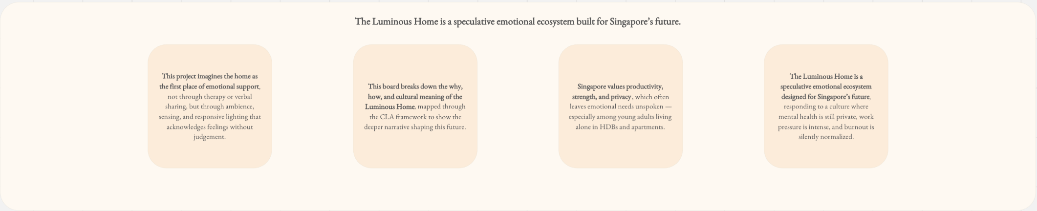The Luminous Home is an emotional ecosystem that responds to stress, fatigue, and emotional overload through subtle changes in light, atmosphere, and spatial behavior. The system is designed to feel supportive without demanding attention or emotional disclosure.