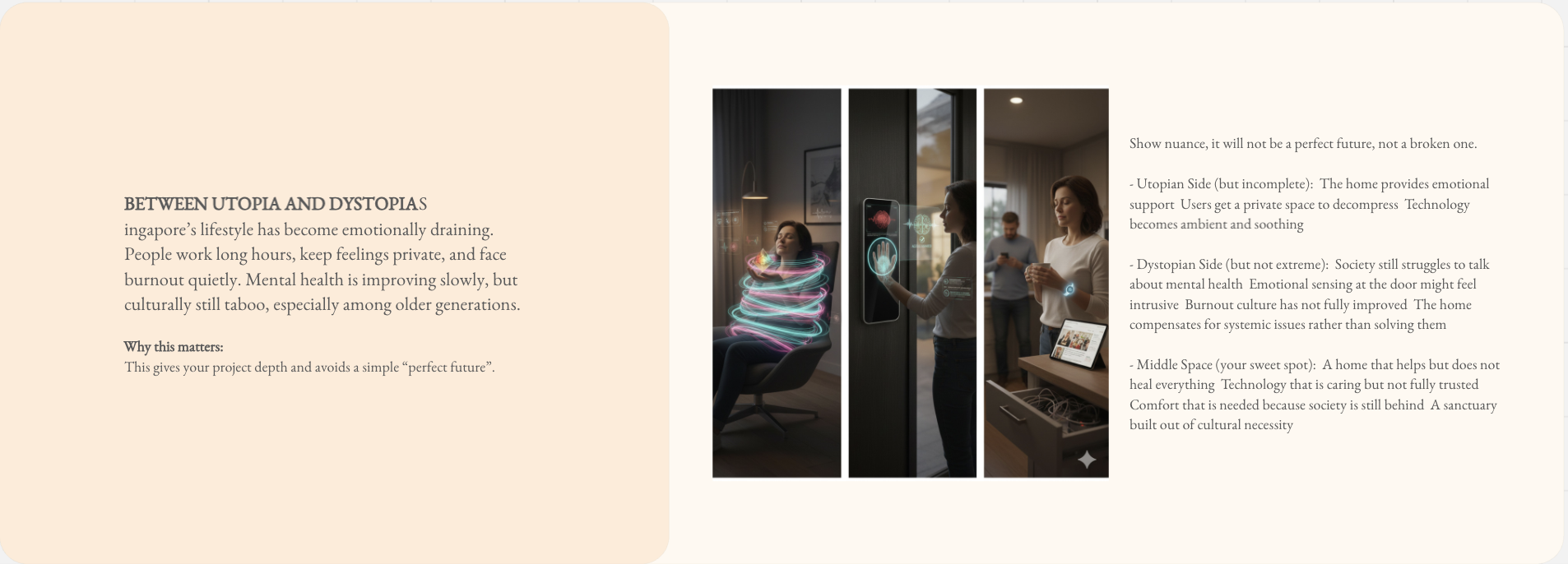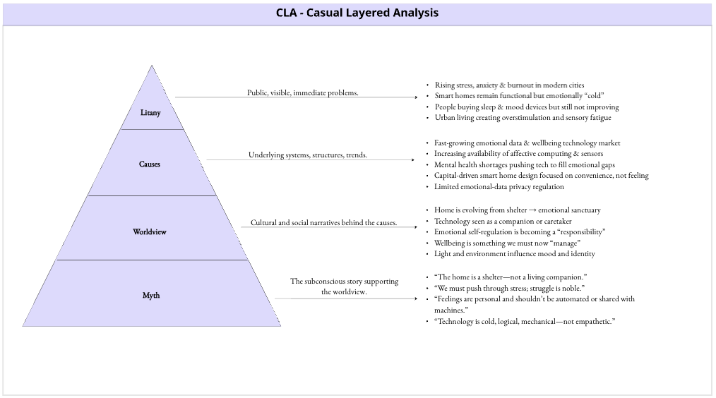 The project is grounded in futures research and qualitative analysis. I conducted signal scanning, trend analysis, and scenario building to explore emerging emotional, cultural, and technological shifts related to mental health and domestic spaces.